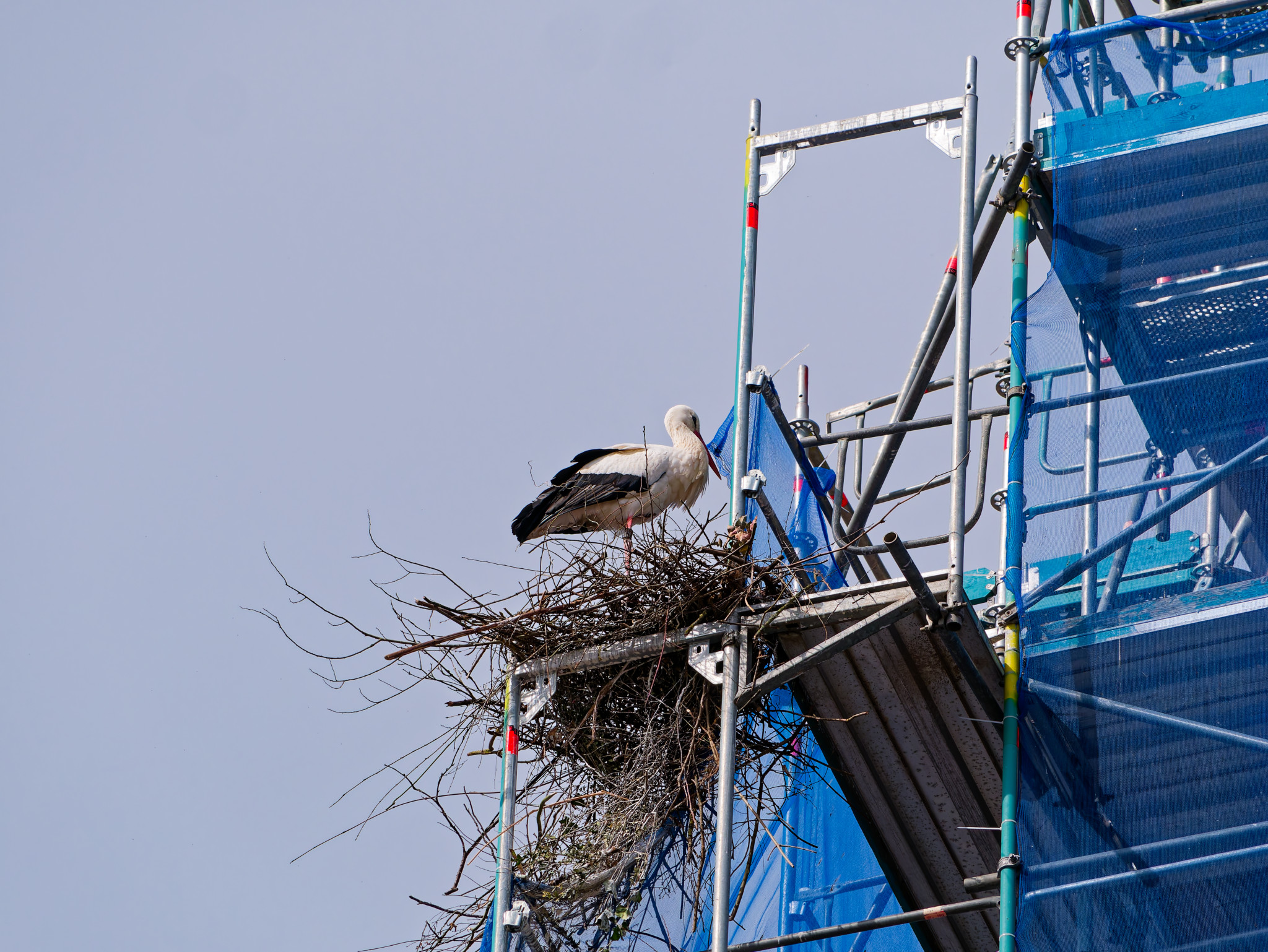 Der Storch links hat sich wohl einen etwas ungünstigen Platz zum Brüten ausgesucht. Der Schornstein daneben scheint noch in Betrieb zu sein. Hoffentlich muss die Feuerwehr nicht per Sirene alarmiert werden.
