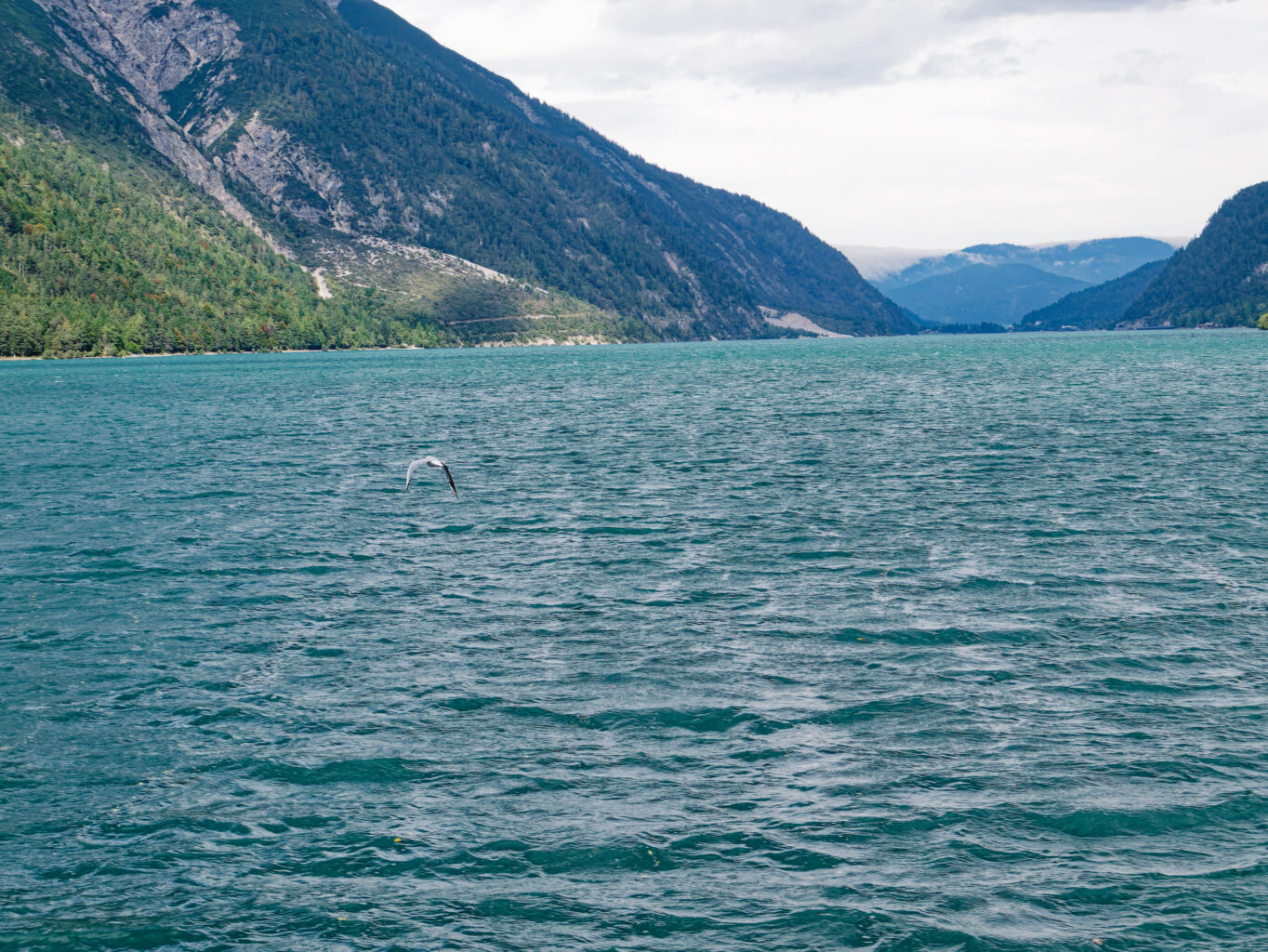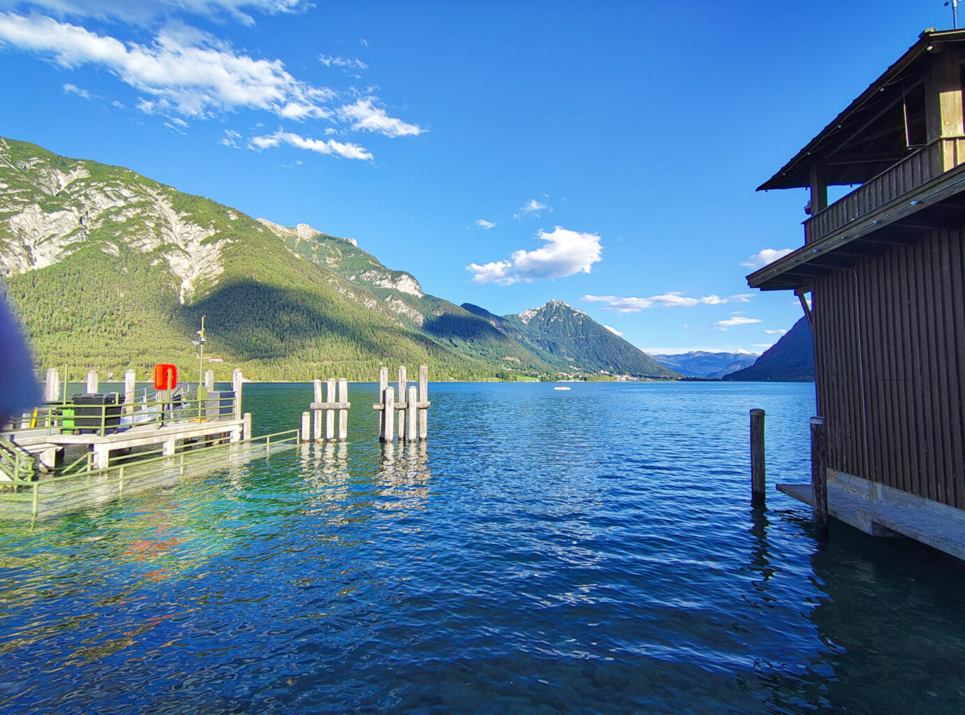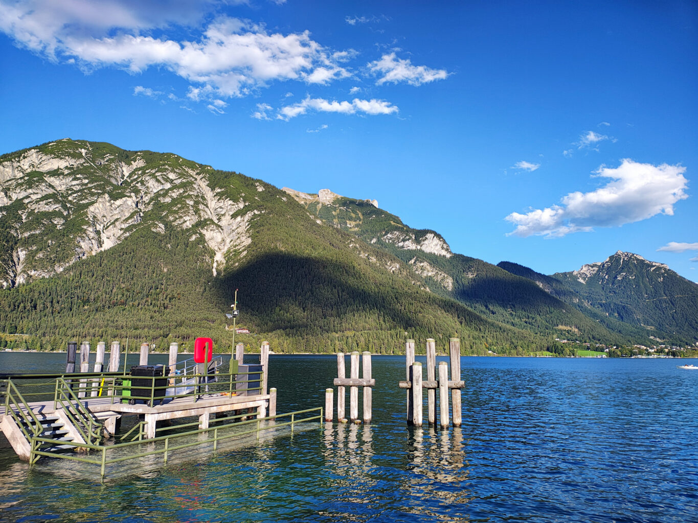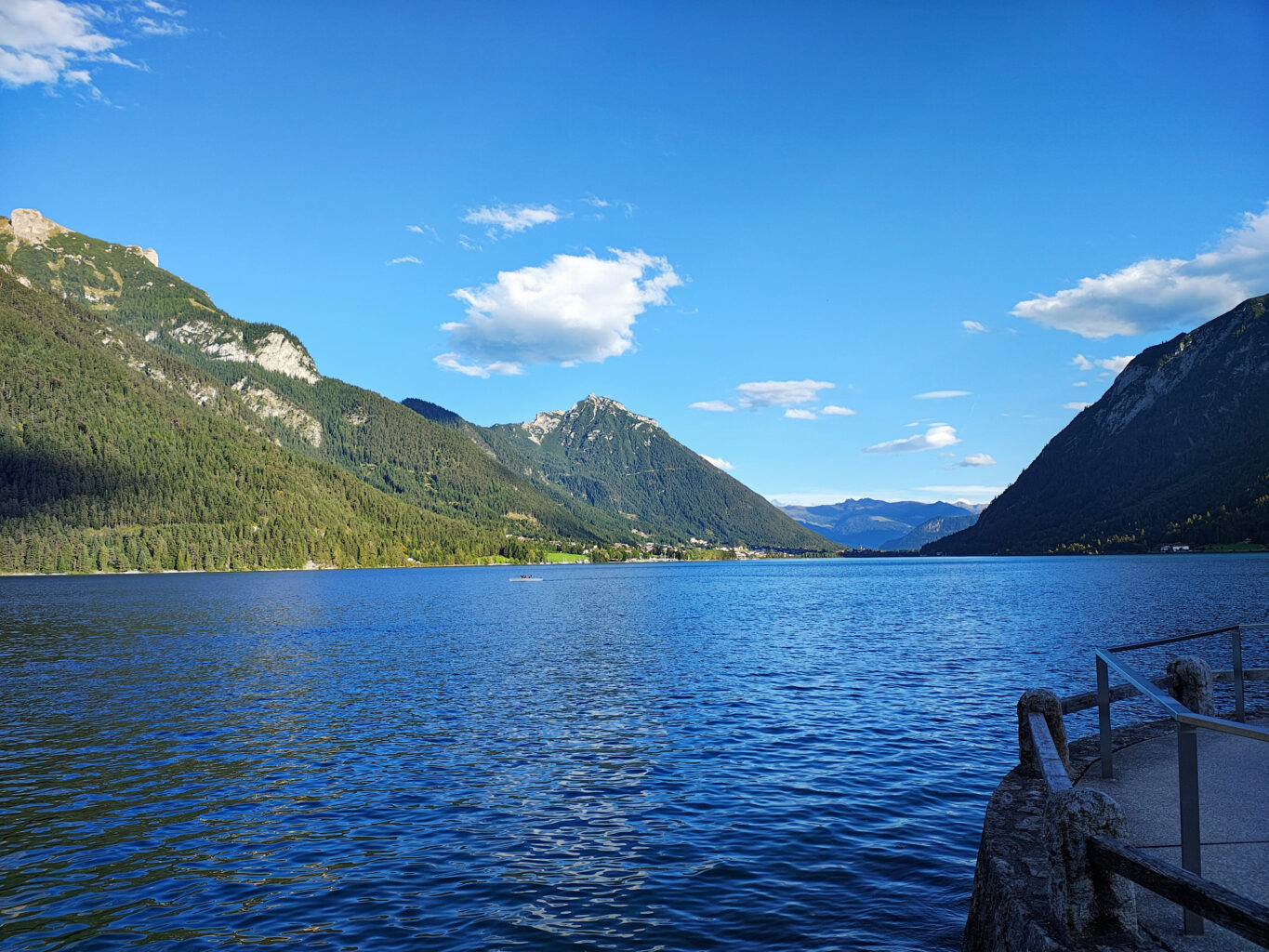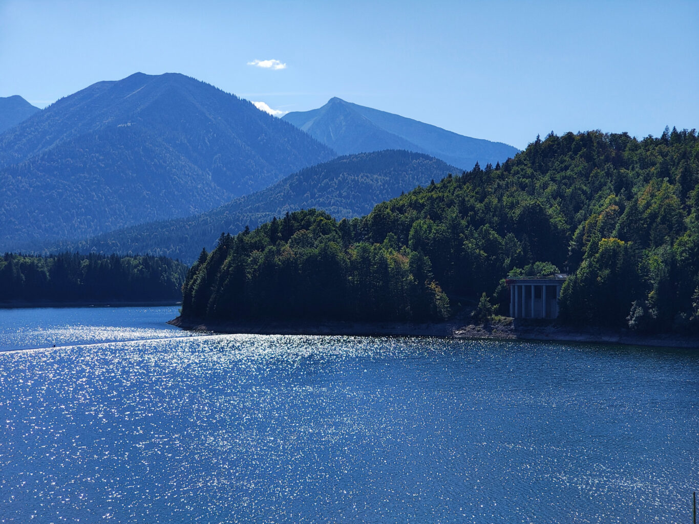 Nicht weit von der deutsch-österreichischen Grenze liegt der Achensee, der größte See in Tirol. Von uns aus an München vorbei fährt man zuerst am Sylvensteinspeicher vorbei. Bei schönem Wetter war die ganze Staumauer, über die man fährt, von Bikern besetzt. Wir konnten erst etwas später parken und die Aussicht genießen.