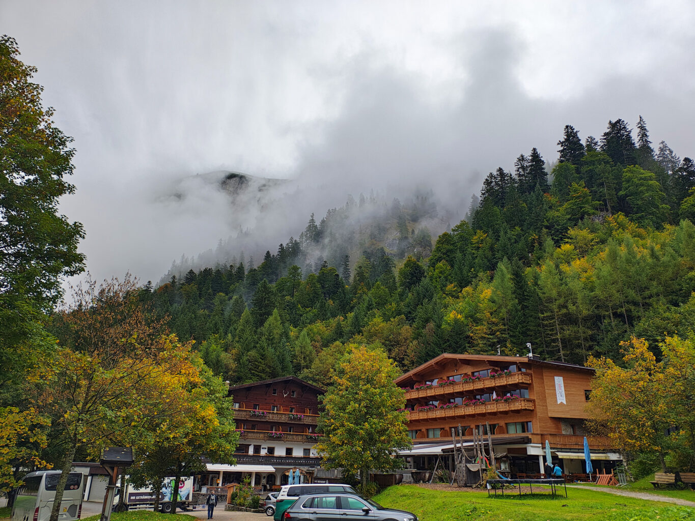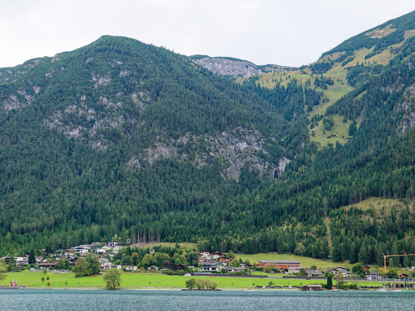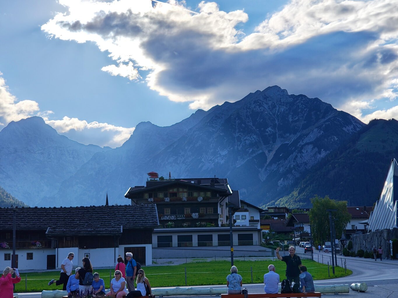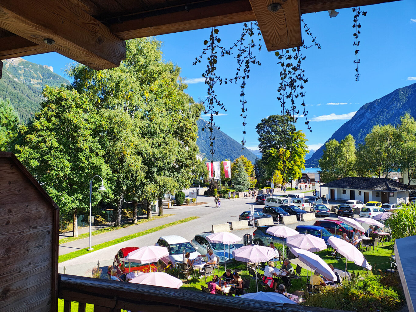 Weiter ging es um den Achensee herum zu unserem Zielort Pertisau. Die Straße an der Ostseite des reichlich acht Kilometer langen Sees wurde erst 1955 fertiggestellt. Pertisau im Südosten erreicht man auf einer Nebenstraße. Danach geht an der Westseite des Sees in Richtung Norden nur ein Wanderweg weiter. Quasi ein bisschen am Ende der Welt also. Nichtsdesdotrotz war bei unserer Ankunft ziemlicher Trubel im Ort, das Wetter hervorragend und der Ort voller Touristen. Insgesammt scheint die ganze Region ganz auf Tourismus eingestellt zu sein. In Pertisau haben wir ca. fünf Hotels auf engem Raum gesehen.