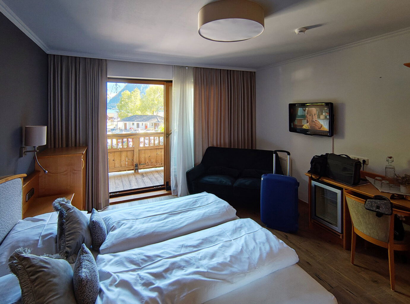 Unser Hotel hatte ein geräumiges Zimmer, ein immer kuschelwarmes Bad und einen Balkon mit einem (leicht übertriebenem) Seeblick.