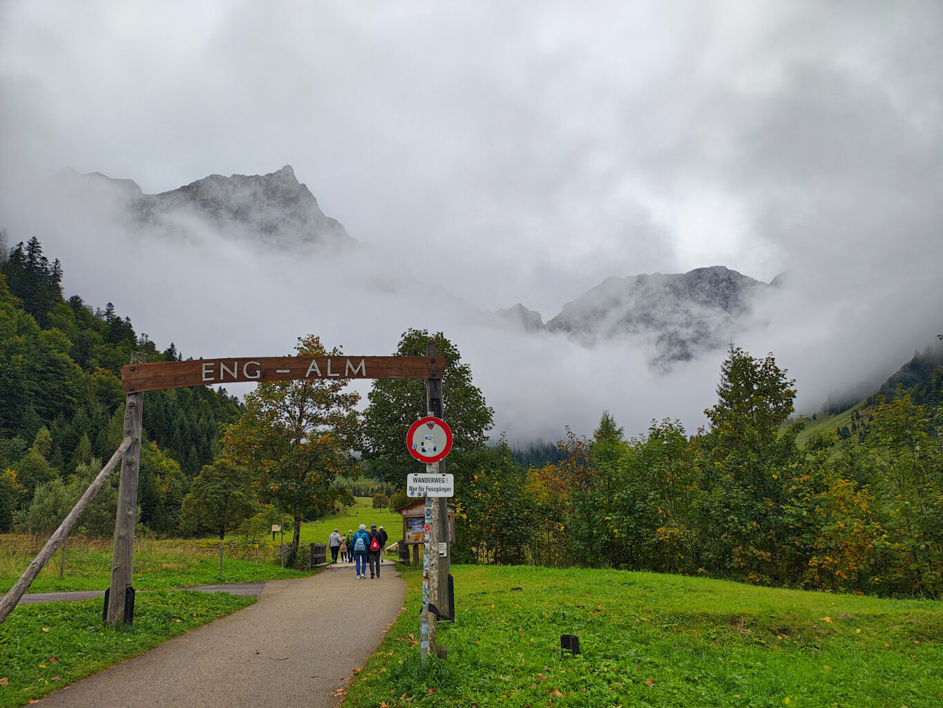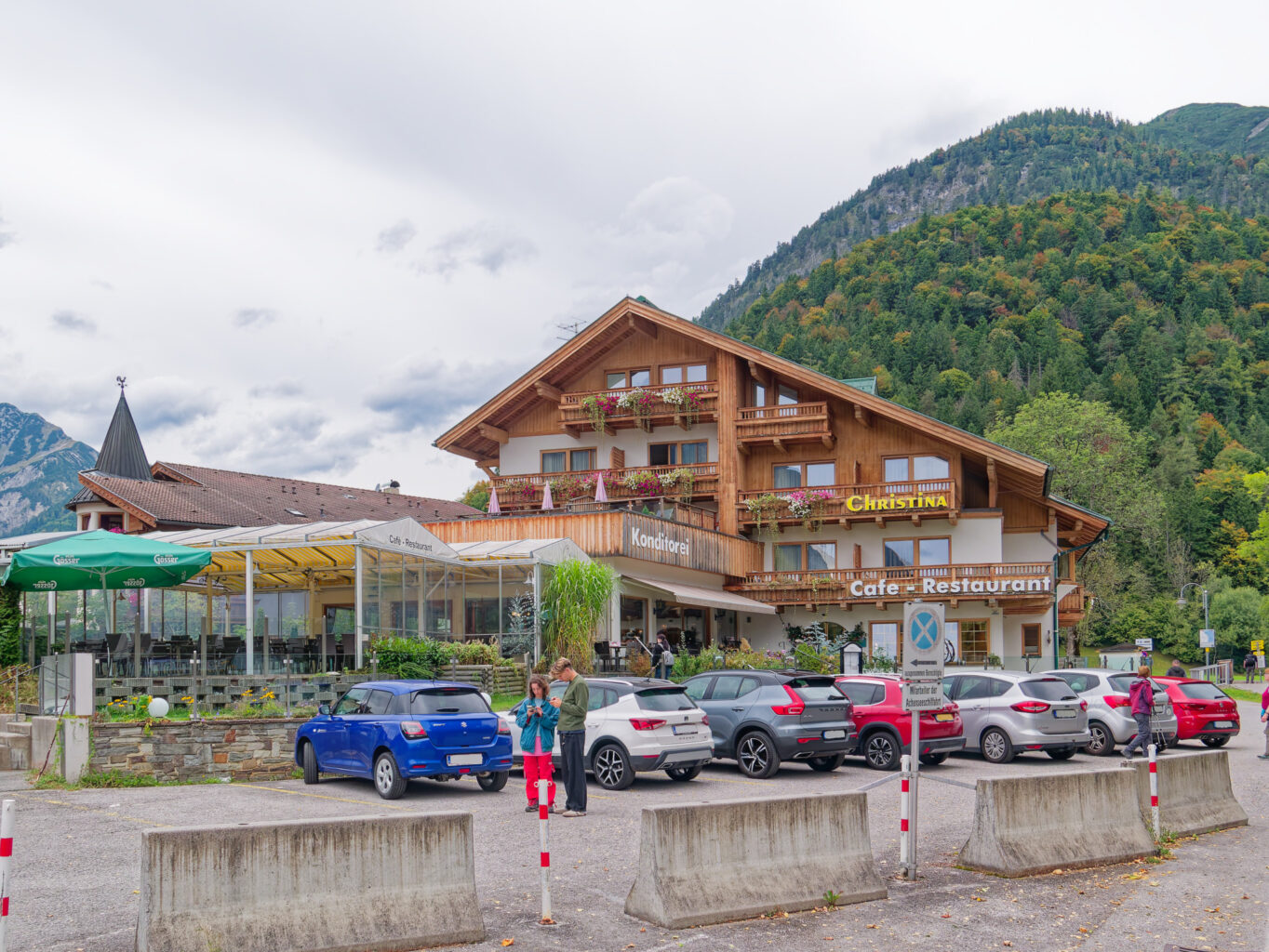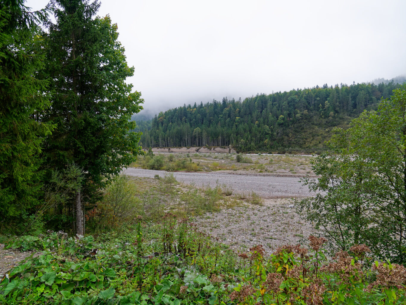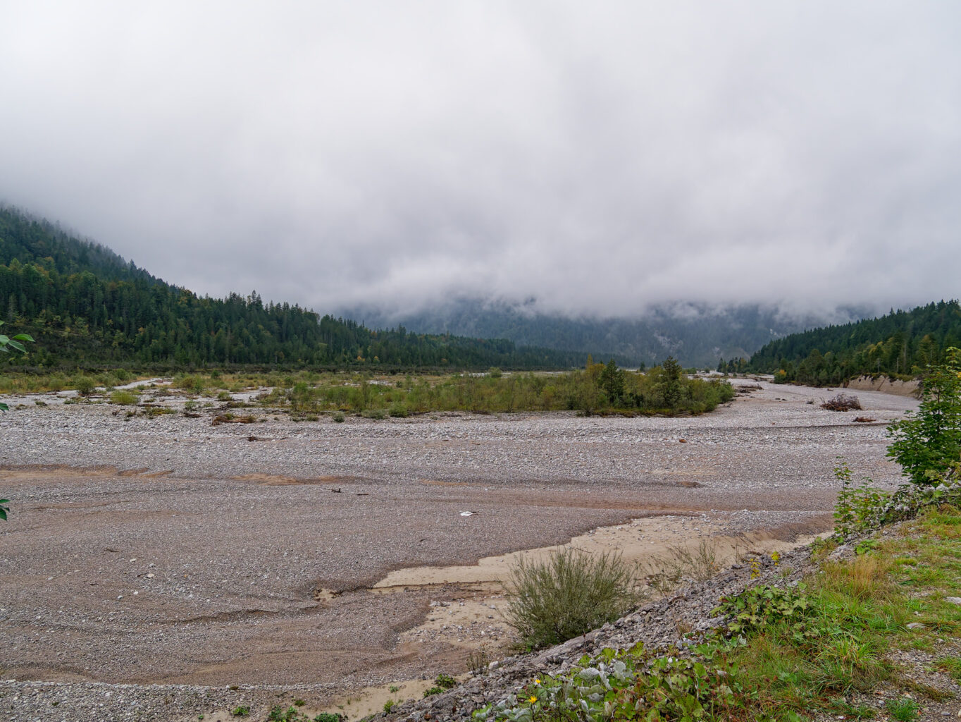 Am nächsten Tag war unser Urlaub leider auch schon wieder zu Ende. Bei der Rückfahrt wollten wir noch in Alpe Eng vorbeischauen. Der Ort, bzw. die Alm oder das große Hotel haben nur eine einzige, knapp 20 Kilometer lange Zufahrt, die im Winter auch noch komplett gesperrt ist. Für die Durchfahrt muss eine extra Maut entrichtet werden, da es sich um eine privat unterhaltene Straße handelt. Die Fahrt geht dabei durch eine seltene Landschaft, das sogenannte Riß, welches ein fast ausgetrocknetes Kiesbett mit ein paar Rinnsalen ist. Im Frühling bei Tauwetter sieht das evtl. ganz anders aus.