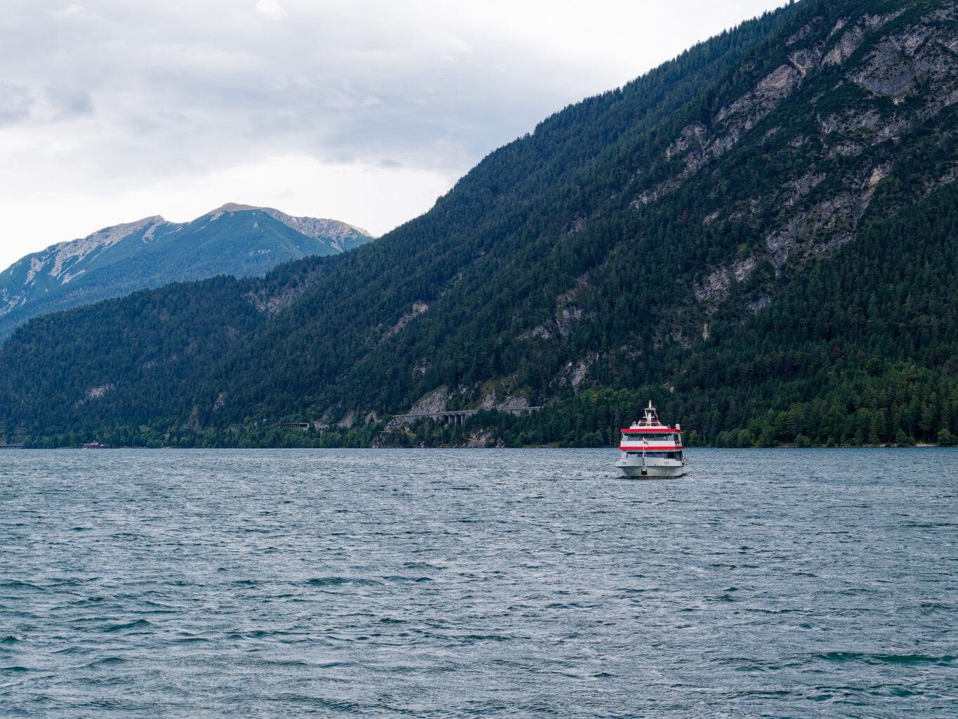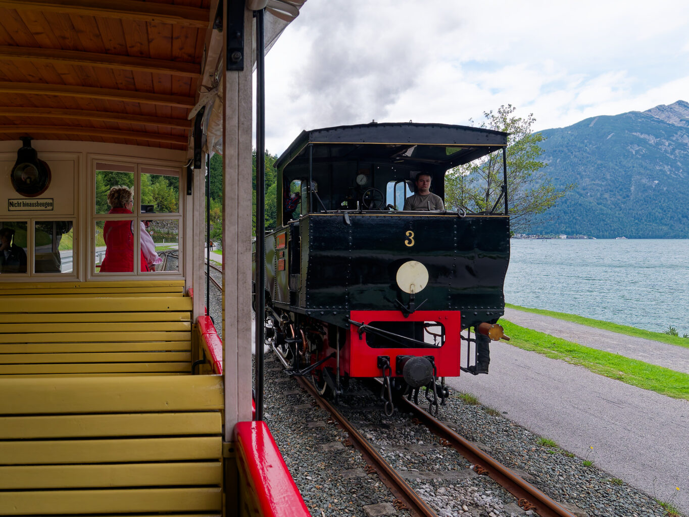 Am zweiten Tag war eine Schiffsreise geplant. Auf dem Achensee werden zwei Rundfahren angeboten, Nord und Süd, wir nahmen beide. Mit einem Kombiticket kann man zusätzlich mit der Achenseebahn fahren, einer kleinen mehrspurigen Zahnradbahn, die durch eine Dampflokomitive fortbewegt wird.