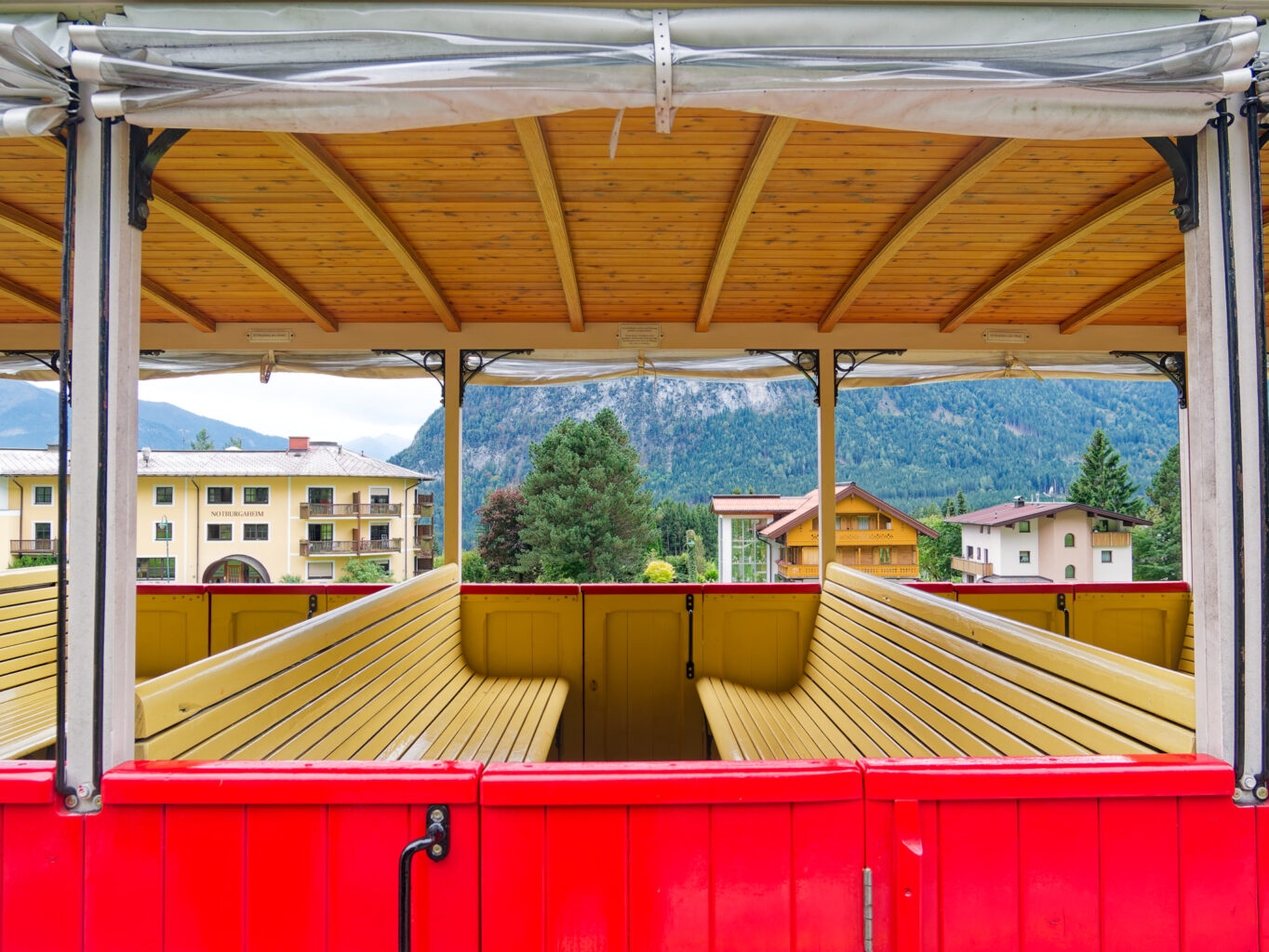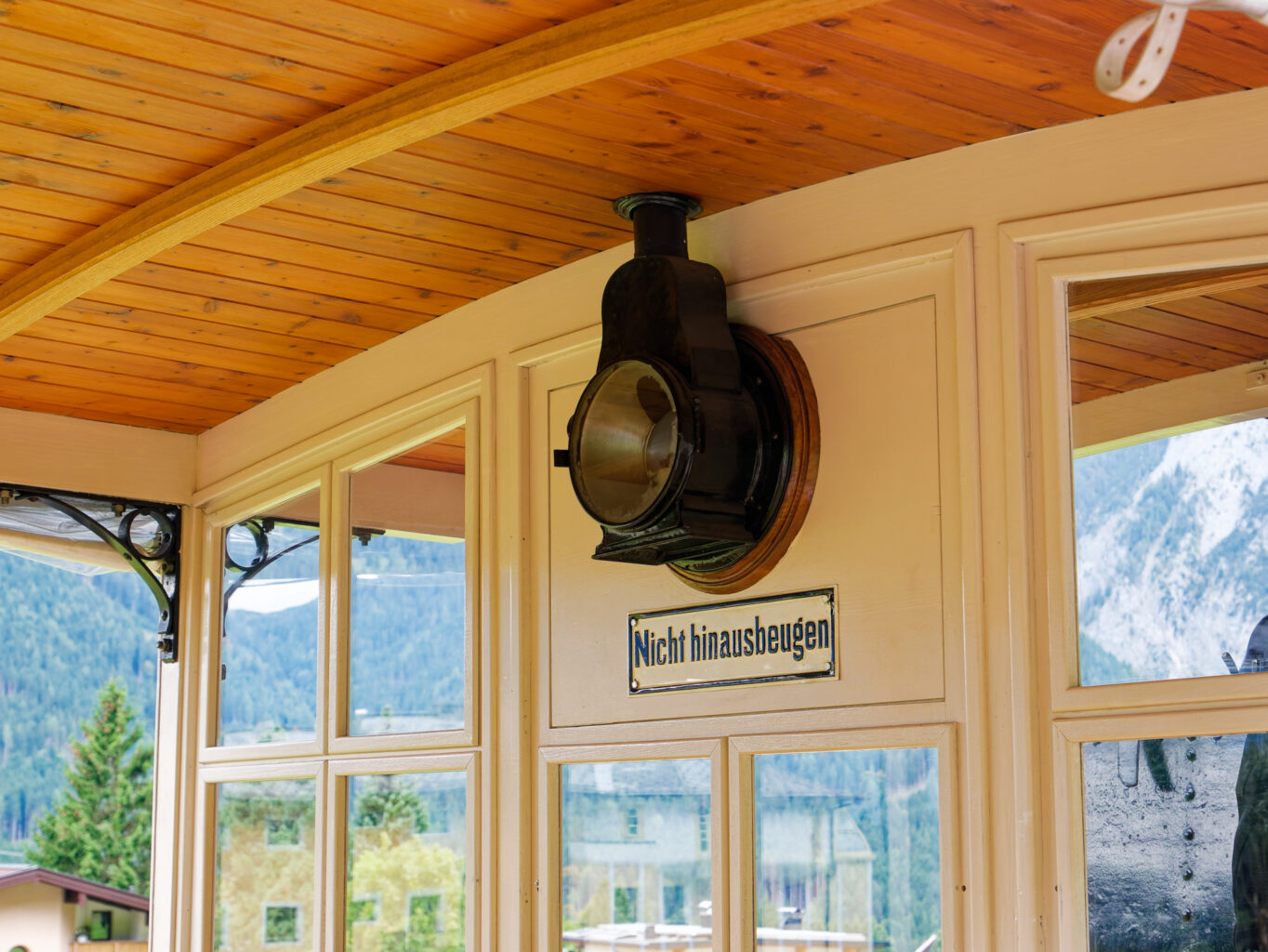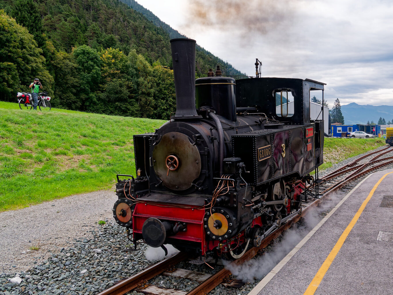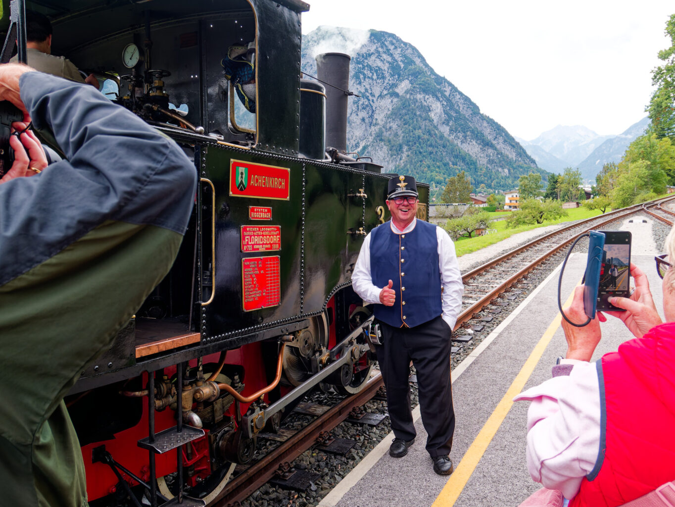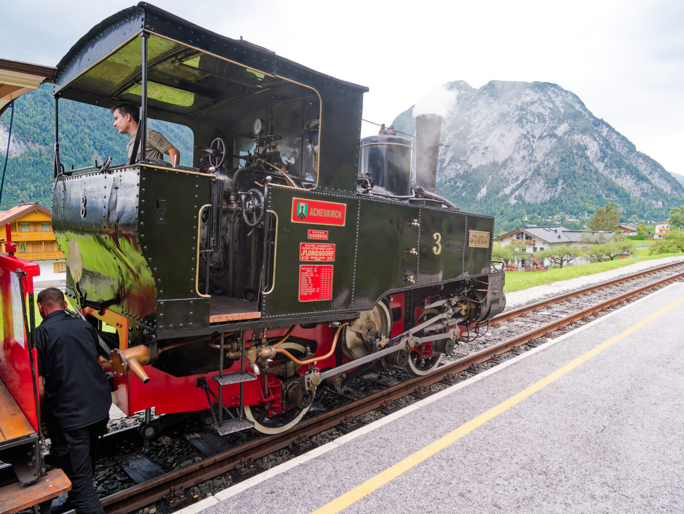 Im südlichen Teil des Sees angekommen stiegen wir in Seespitz in die Achenseebahn um. Die Haltestelle des Zuges befindet sich direkt am Schiffsanleger. Es war ausgesprochen urig, mit so einem kleinen „Rumpelzug“, ziemlichem Qualm in der Kabine und ausgiebigen Pfeifsignalen an Stellen, an der eine Straße überquert wird durch die Gegend zu fahren – inkl. eines lustigen uniformierten Schaffners.