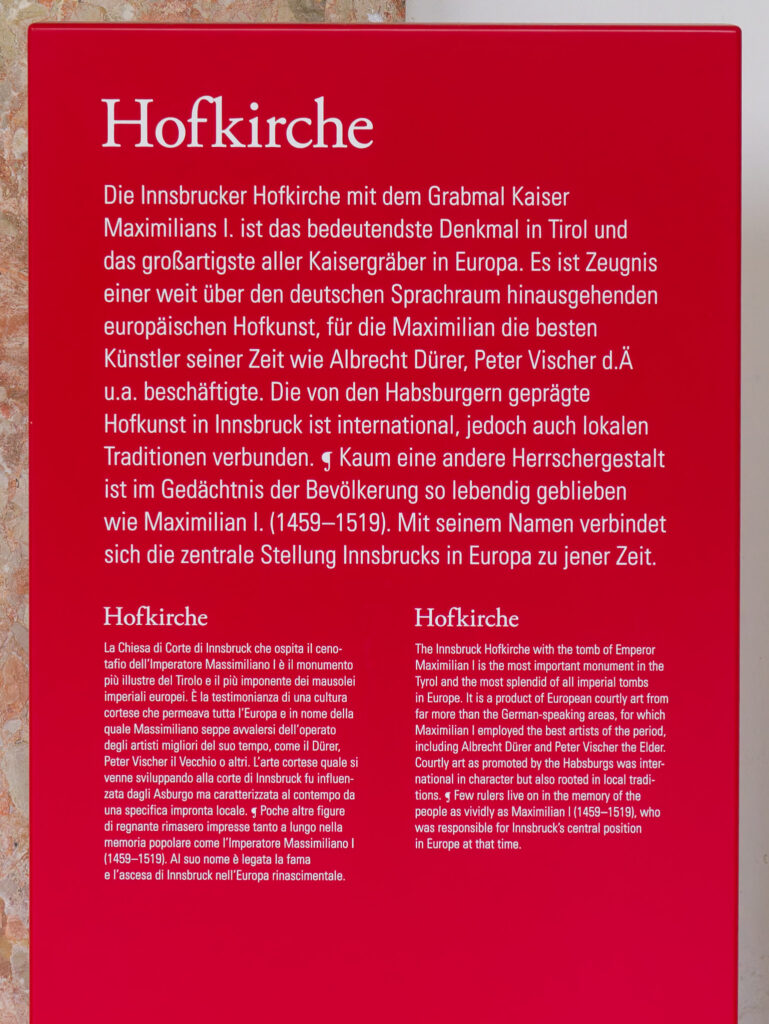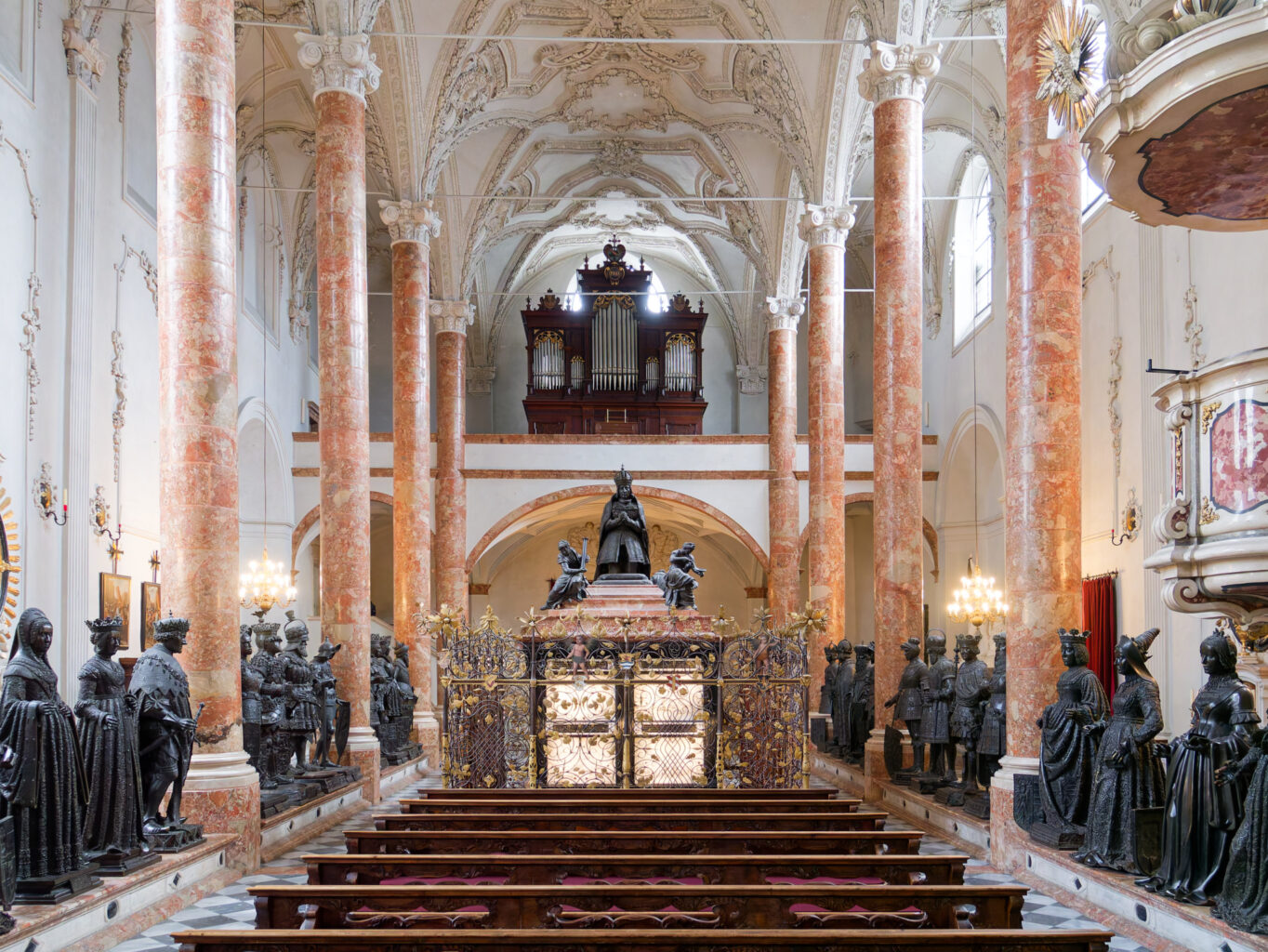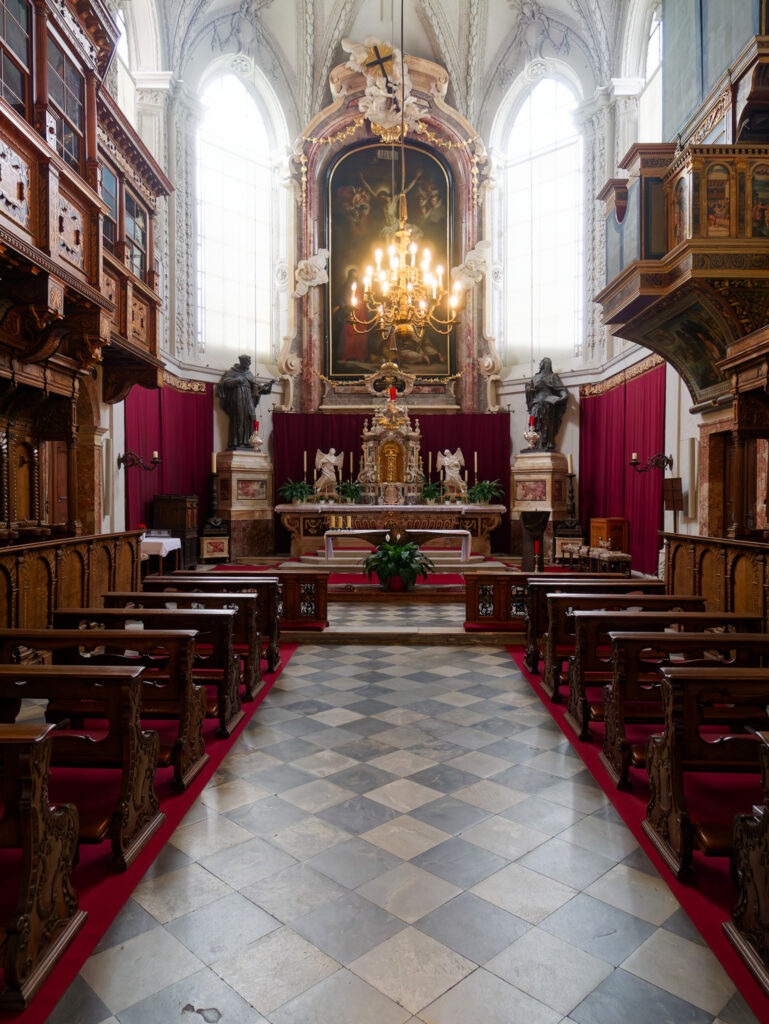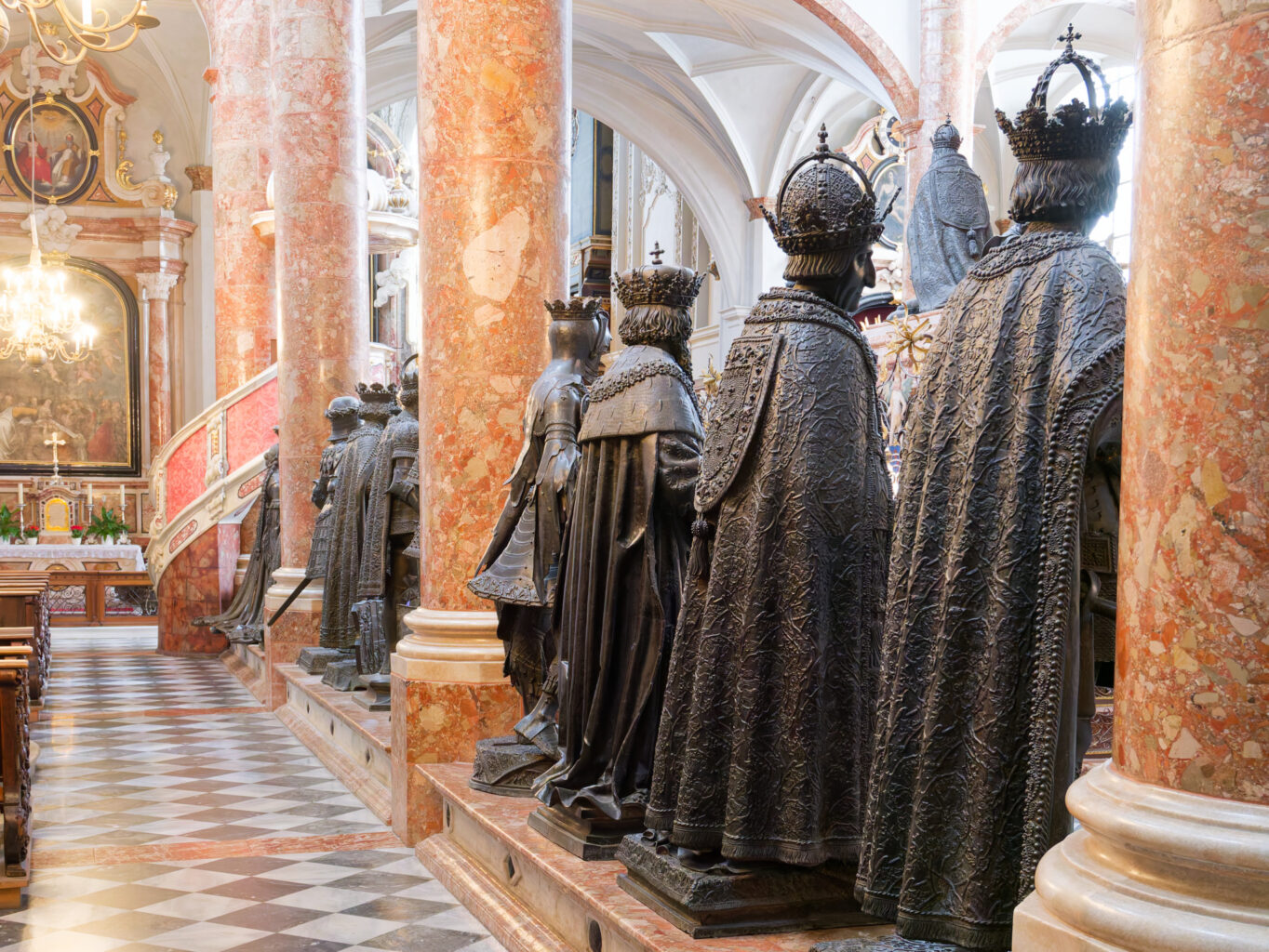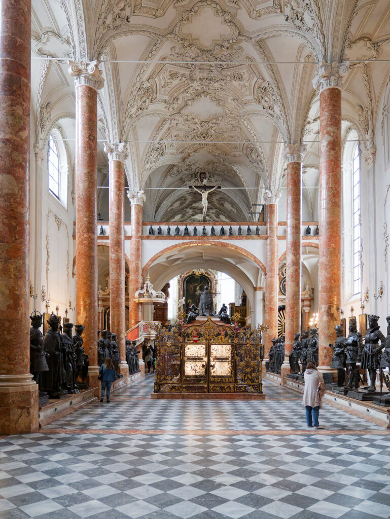 Danach stand die Hofkirche auf dem Programm, in welcher beeindruckende Bronzeskulpturen besichtigt werden können. Wir hatten offenbar wieder einmal Glück, denn wir erwischten aus dem Innenhof heraus einen Eingang in einen Raum, in dem jemand aufpasste, aber ansonsten nur viele Bilder an der Wand hingen. Nach eine Weile fragte uns der Aufpasser, ob wir Zeit hätten, was wir bejahten. Er erklärte uns, dass in diesem und den anschließenden zwei Räumen eine Multimediashow geboten wird. Die Türen öffnen sich automatisch. Er verließ uns und schloss die Eingangstür. Wir waren sehr überrascht, was alles geboten wurde. Nach den drei Räumen kommt man dann in die Hofkirche selbst.